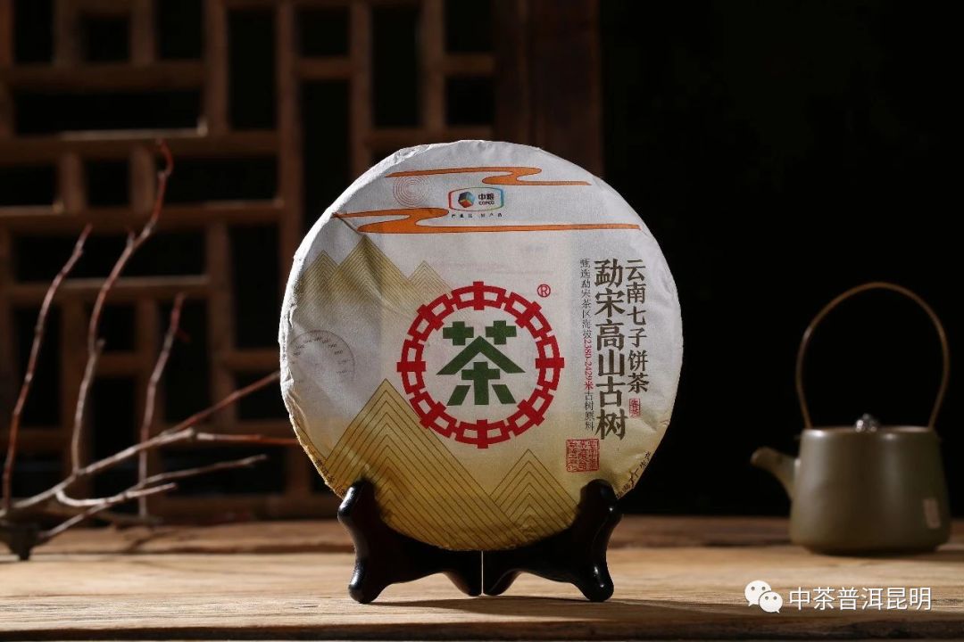 中茶云南七子餅茶—勐宋高山古樹 普洱茶(生茶)精選西雙版納州勐??h勐宋區(qū)域明前大樹茶菁,傳統(tǒng)曬青毛茶工藝加工,蒸壓成型。