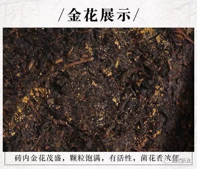 遵傳統(tǒng)自然發(fā)花工藝,磚內(nèi)金花茂盛,菌香馥郁;湯色橙黃油潤,滋味醇厚!