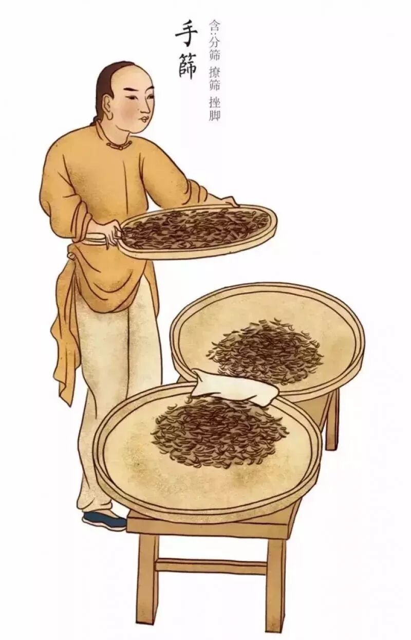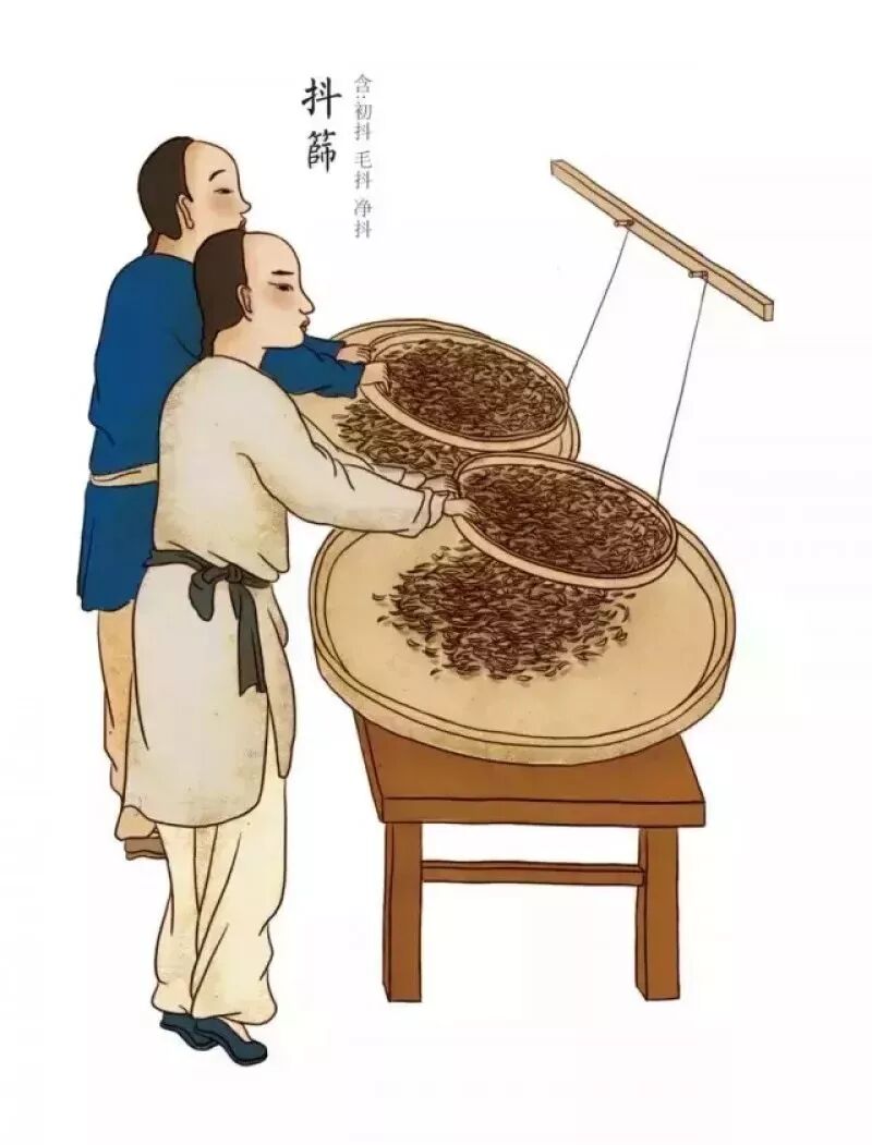 歷史上,祁紅精制全靠手工,新中國(guó)成立后除高檔茶仍沿用手工外,中檔低檔茶基本由機(jī)器制作。機(jī)器精制,工序相對(duì)復(fù)雜,總的來(lái)說(shuō)有毛篩、切斷、抖篩、分篩、撩篩、風(fēng)選、緊門(mén)、套篩、揀剔、拼和、補(bǔ)火、裝箱等十二道工序。