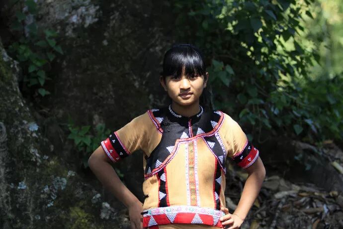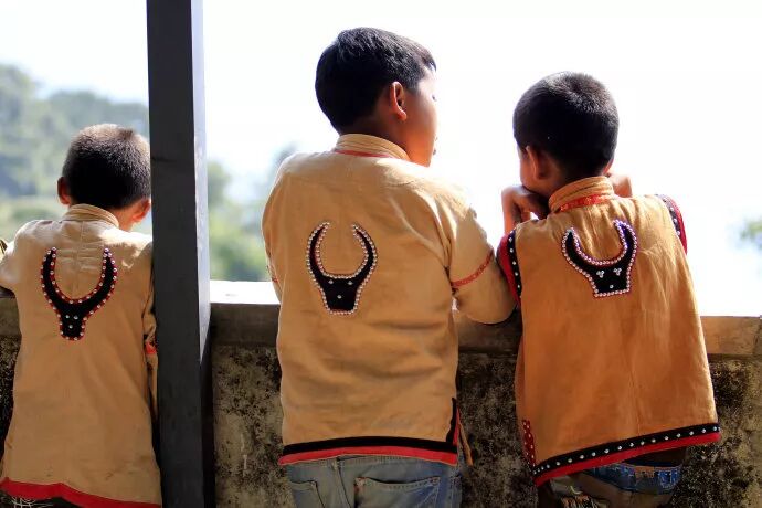 美麗的黃佤服裝是黃佤人自己一線一線織出來的,女孩衣角繡花,而男孩背后有牛頭。