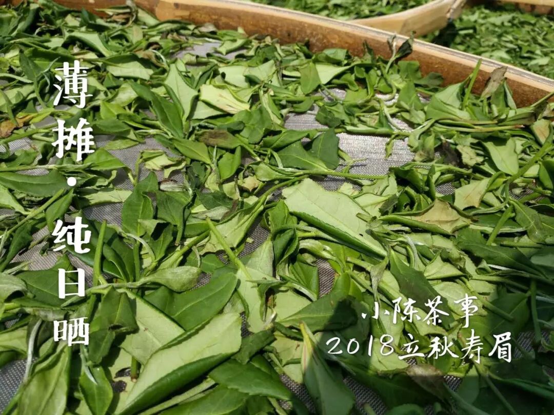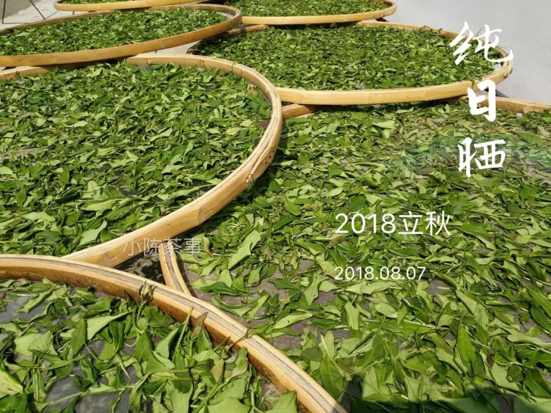 這些后天因素,就是秋茶季略高于春茶季的氣溫和光照。這猶帶著秋老虎般力量的溫度和陽(yáng)光,讓秋白茶在攤晾和曬制的時(shí)候,葉綠素加速分解,葉黃素和葉紅素加速呈現(xiàn)出來(lái)。