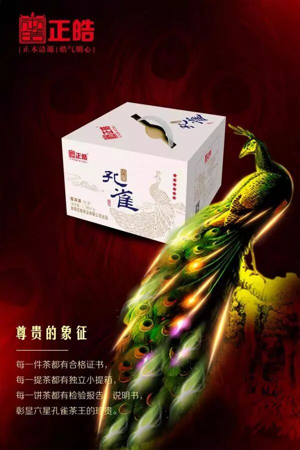 孔雀被視為"百鳥之王",是最美麗的觀賞品,是吉祥、善良、美麗、華貴的象征。在茶行業(yè)內(nèi)“孔雀”是高品質(zhì)的代名詞,正皓孔雀茶王,用料精良,工藝考究,以六星級的拼配技術(shù),以孔雀命名,是尊貴品味的體現(xiàn),是極佳的品飲與收藏珍品。