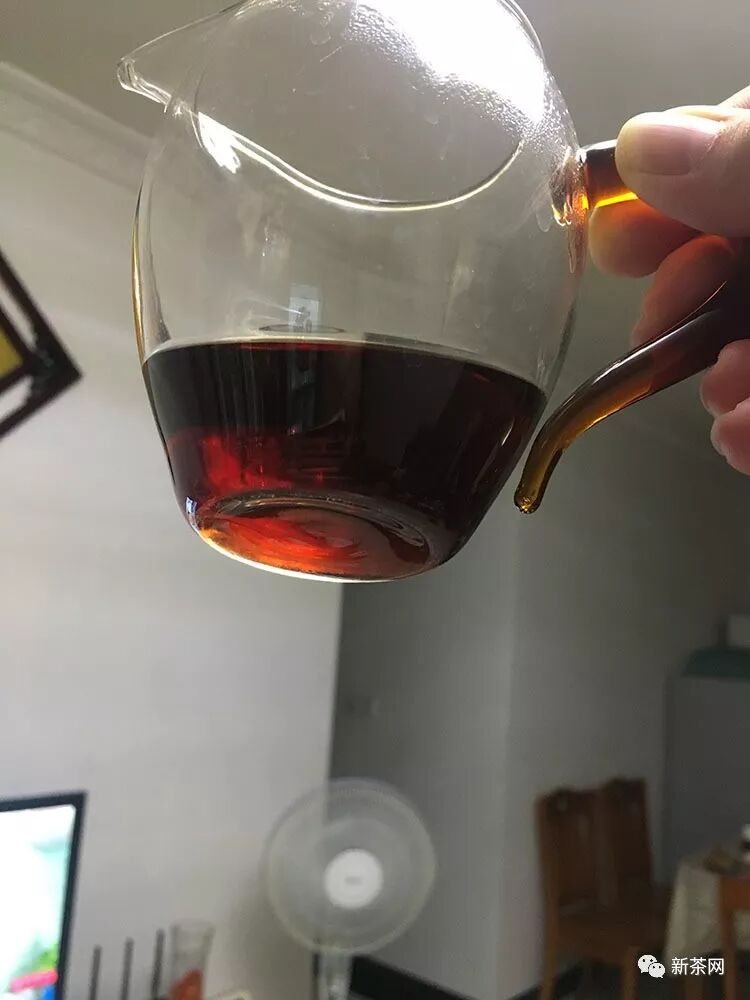 初嘗:本款茶湯色紅濃透亮,口感醇厚順滑,茶韻下沉,適口感較好,是一款較好的熟茶。