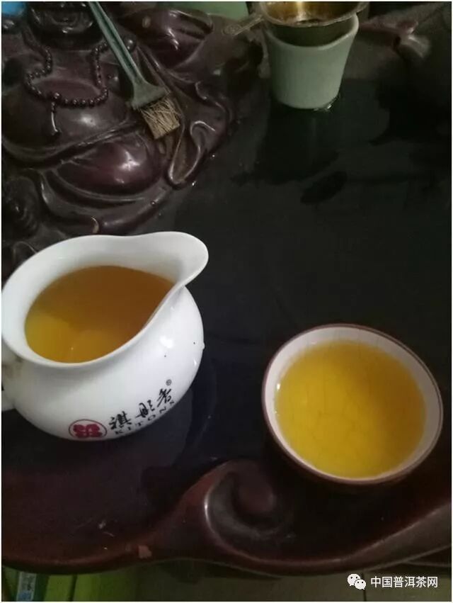 第一泡:茶湯橙黃透亮,端起茶杯,一股濃厚的松煙味直入心扉,為下關(guān)茶無疑,輕嘗茶湯,茶味濃烈,兩頰生津、回甘猛烈,沖第二泡時明顯感覺茶氣直沖腦門。