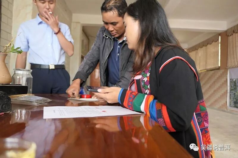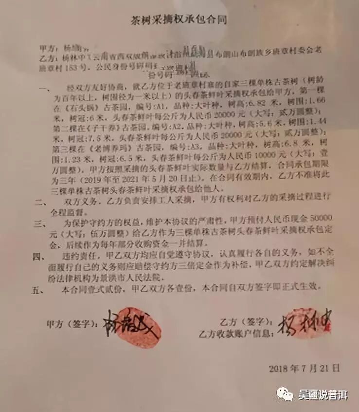 我與楊培成先生同行,他去簽訂三顆單株的合同,我粗略看了一下價格,即使按去年4.3公斤鮮葉做一公斤毛茶的價格來計算,一公斤老班章收購成本約合8.6萬元人民幣了。三顆茶樹如果明年收成好即可達百萬,我和茶農開玩笑,你守著三棵樹就可以當百萬富翁了。