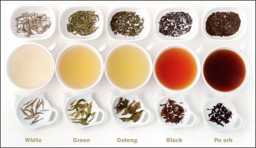 從左到右:白茶、綠茶、烏龍、紅茶和普洱(黑茶)