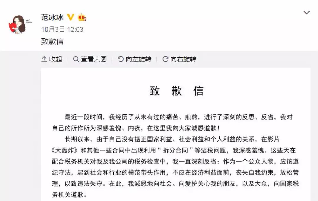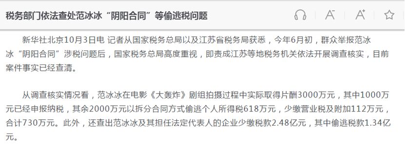 10月3日,稅務(wù)部門依法查處范冰冰偷逃稅問題,追繳稅款、加收滯納金和罰款共計8.84億元。自2004年開始,范冰冰連續(xù)十四年入榜福布斯中國名人收入榜,2013年起更是蟬聯(lián)了五年榜單榜首。范冰冰曾說:“我從來沒想過要嫁入豪門,因為我覺得我就是豪門,誰要來就嫁給我吧!”(我倒是很尊重很多好演員,但此人在我眼中一直是個戲子,并非現(xiàn)在放馬后炮,注意:演員和戲子是有區(qū)別的)