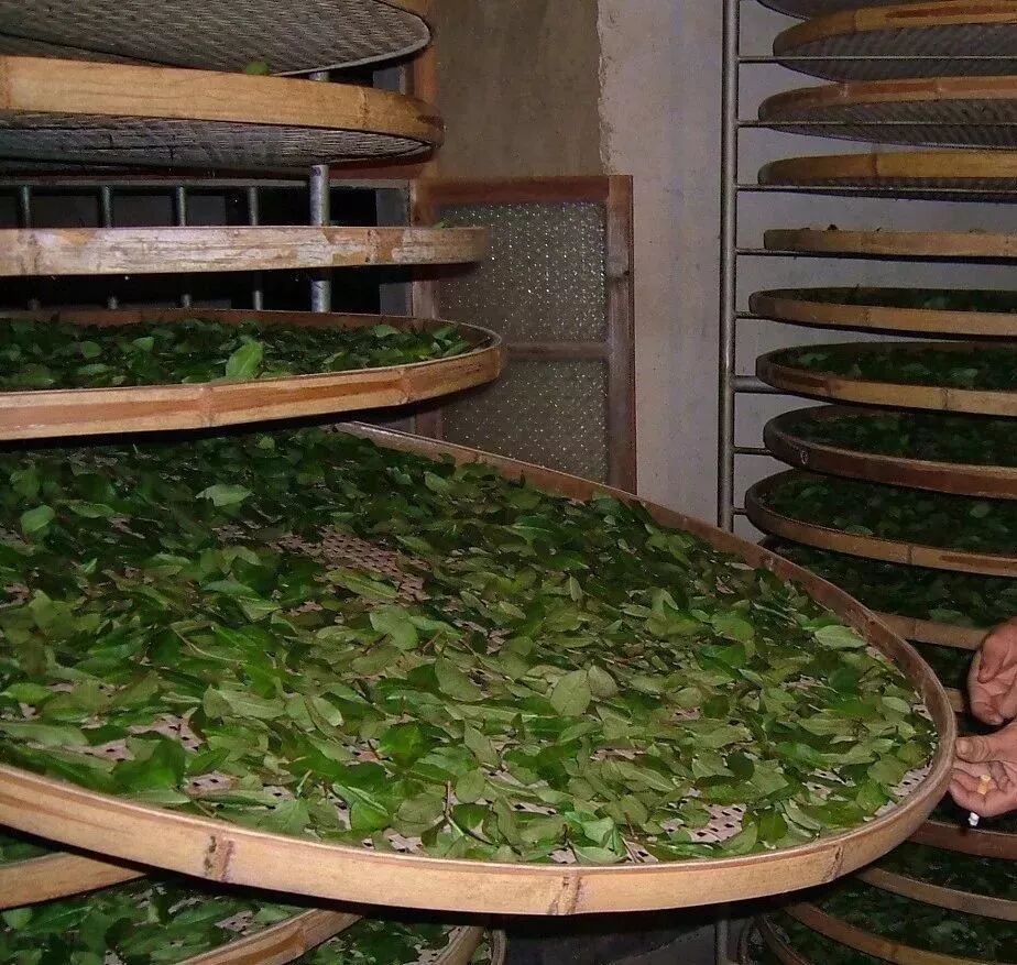 采回的茶青,要馬上攤晾和萎凋,一是降低從茶園運(yùn)回時(shí)產(chǎn)生的熱量,二是使茶葉含水量降低。