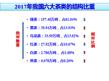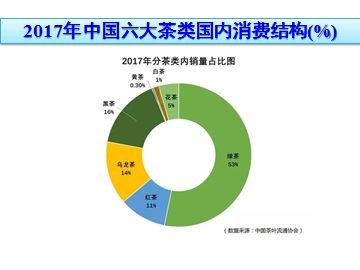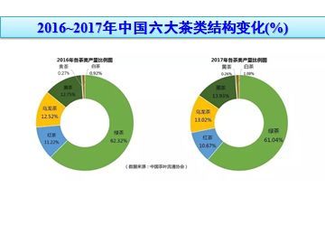 2017年,內(nèi)銷市場中各茶類板塊輪動的局面有所改善,格局相對穩(wěn)定。綠茶仍是主導茶類,黑、紅、白茶增速較快。