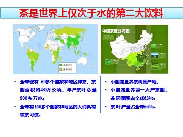 全球現(xiàn)有 50多個國家和地區(qū)種茶,茶園面積約480萬公頃,年產(chǎn)茶葉總量500多萬噸;全球有160多個國家和地區(qū)的人們具有飲茶習慣。