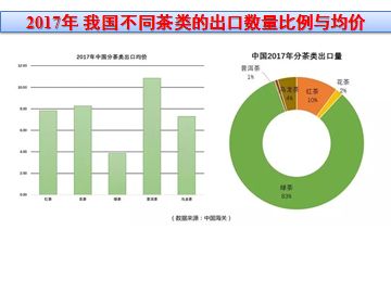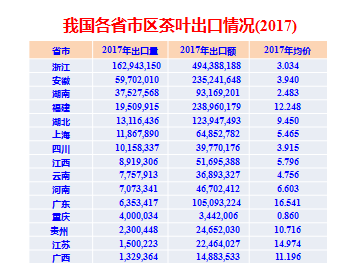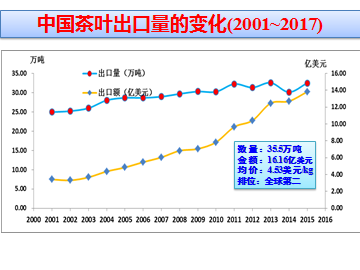 2001年—2017年間我國茶葉出口量及出口額總體呈現(xiàn)上升趨勢,2017年我國茶葉出口總量達35.5萬噸,比增8.1%;出口額達16.16億美元,比增8.7%;出口均價4.53美元/公斤,與2016年基本持平。紅茶、綠茶和花茶出口量均有6%以上的較大幅度提升。其中,浙江、安徽、湖南等省份茶葉出口量位居前列。