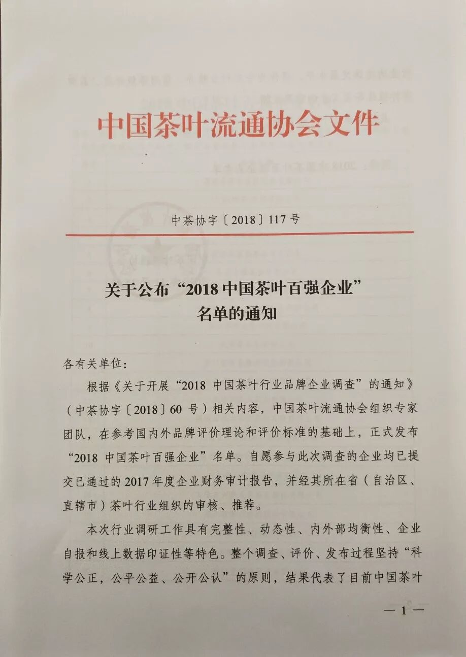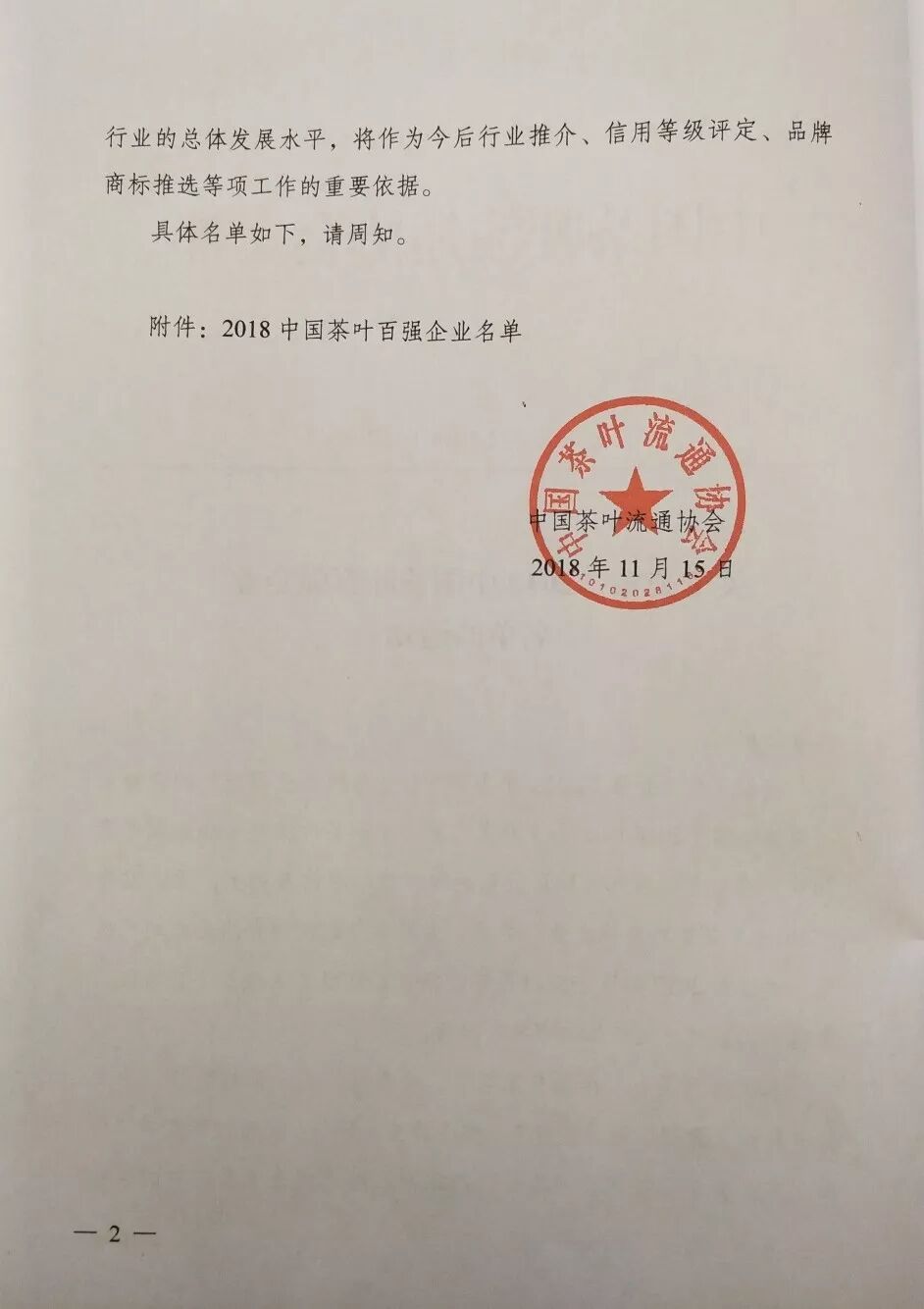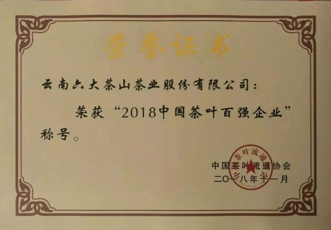 六大茶山榮獲“2018中國茶葉百強企業(yè)”稱號
