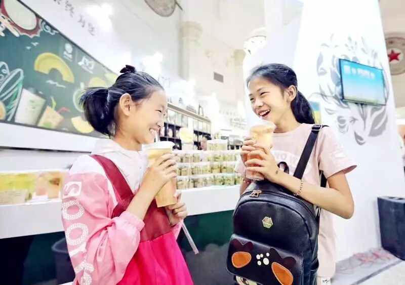 ▲ ?喝著老吳家的茶飲,兩位小姑娘笑得如花兒一般燦爛。
