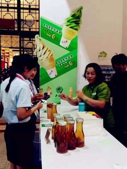 ▲ 顧客在創(chuàng)新茶展區(qū),接過(guò)吳裕泰店員手中的抹茶味冰淇淋。