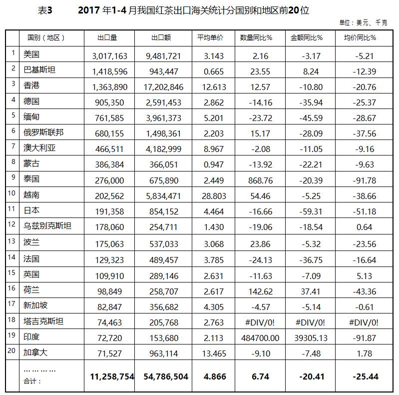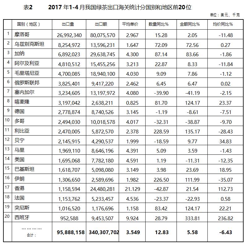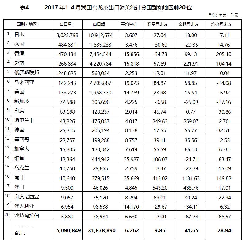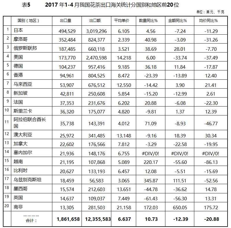 據海關統(tǒng)計,2017 年 1-4 月,我國茶葉出口 11.4 萬噸,金額約 4.4 億美元,同比分別上升11.62%和 2.10%,平均單價 3880 美元/噸,同比下降 8.53%。