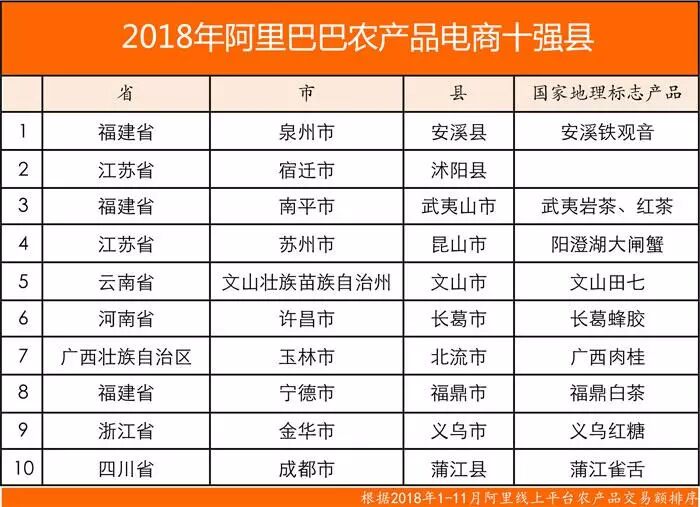 阿里巴巴集團今年前11個月線上農(nóng)產(chǎn)品交易數(shù)據(jù)出爐。以縣域為單位,福建省安溪縣排名第一,江蘇省沭陽縣以微弱差距屈居第二。