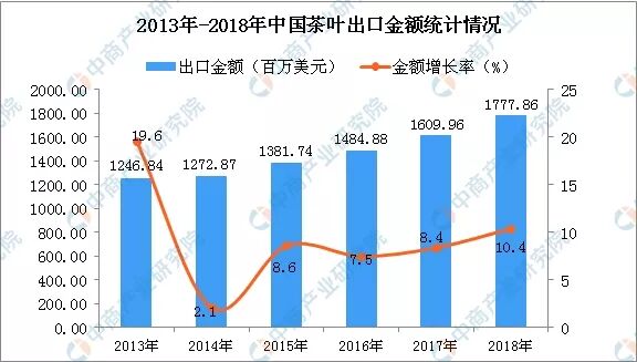 從金額方面來(lái)看,2013年-2018年中國(guó)茶葉出口金額逐漸增長(zhǎng),共增長(zhǎng)531.02百萬(wàn)美元;2018年中國(guó)茶葉出口金額為1777.86百萬(wàn)美元,同比增長(zhǎng)10.4%。