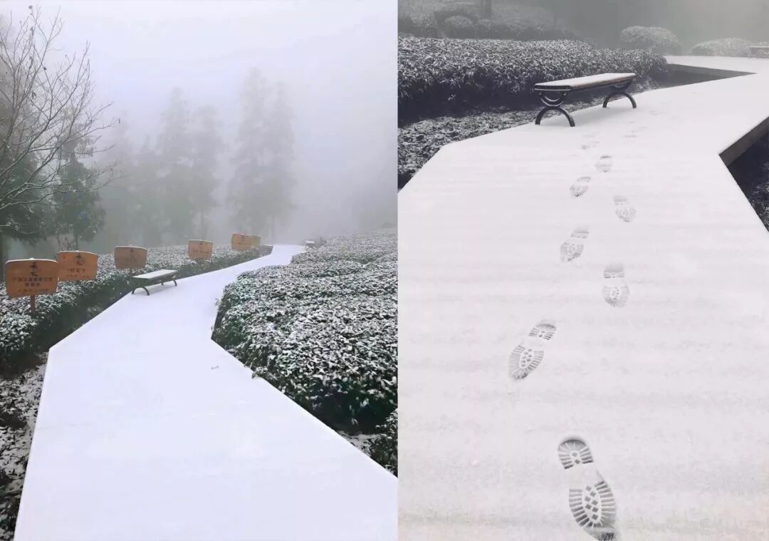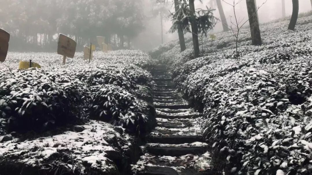 云放峨眉山茶園下雪啦!瑞雪,將讓茶園經(jīng)歷漫漫的霜雪覆蓋和潤澤,使明年茶葉品質(zhì)天生優(yōu)越,純凈安全?!叭鹧┯泻貌琛?。
