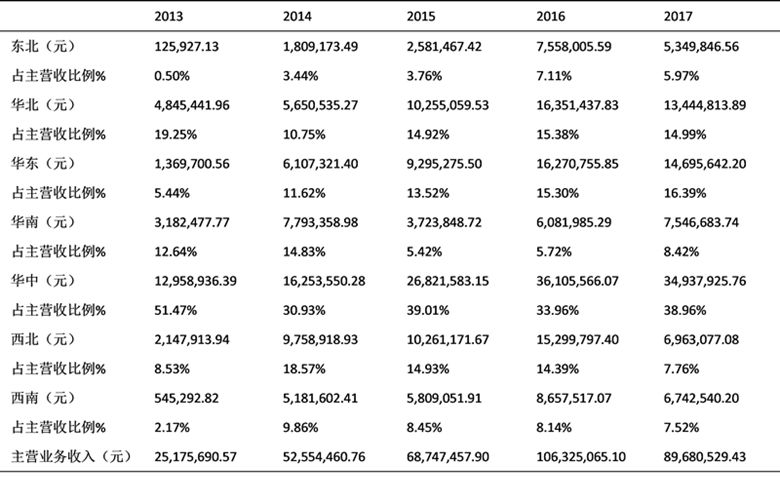 2013—2017年度,該公司主營業(yè)務(wù)收入主要來自于華中地區(qū)。