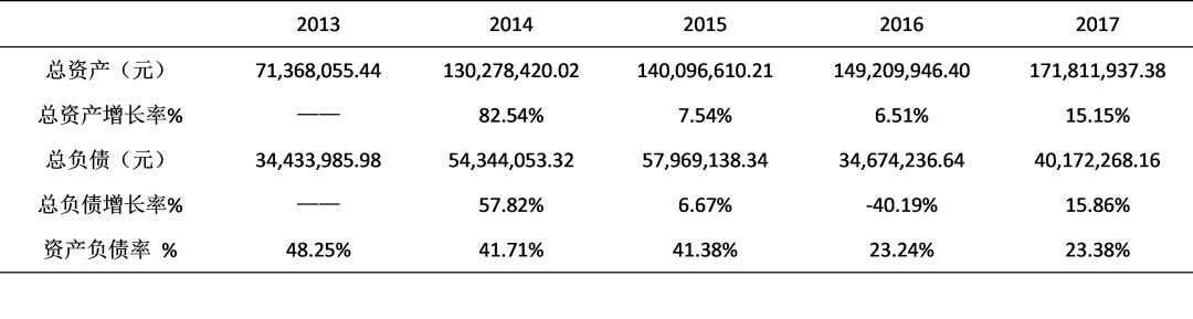 表2  梅山黑茶總資產(chǎn)、總負(fù)債、資產(chǎn)負(fù)債率(2013—2017年度)