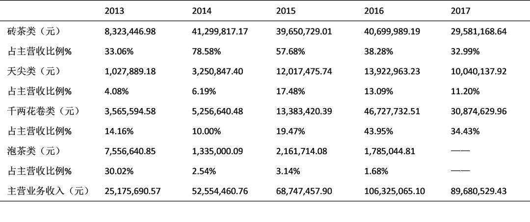 其中,磚茶類營收整體趨勢為先大幅增加后大幅減少,占比最高為2014年度78.58%,占比最低為2017年度32.99%;