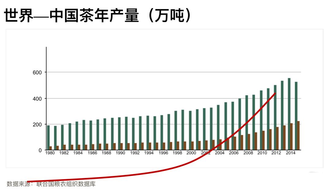 從上圖可以看出,1980年—2015年的35年,中國茶共增長了194.5萬噸,年增長量5.6萬噸。