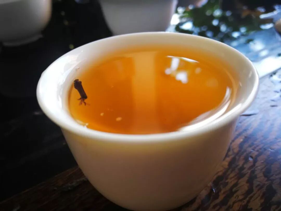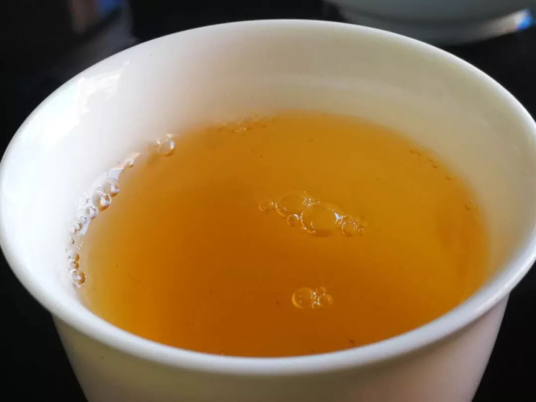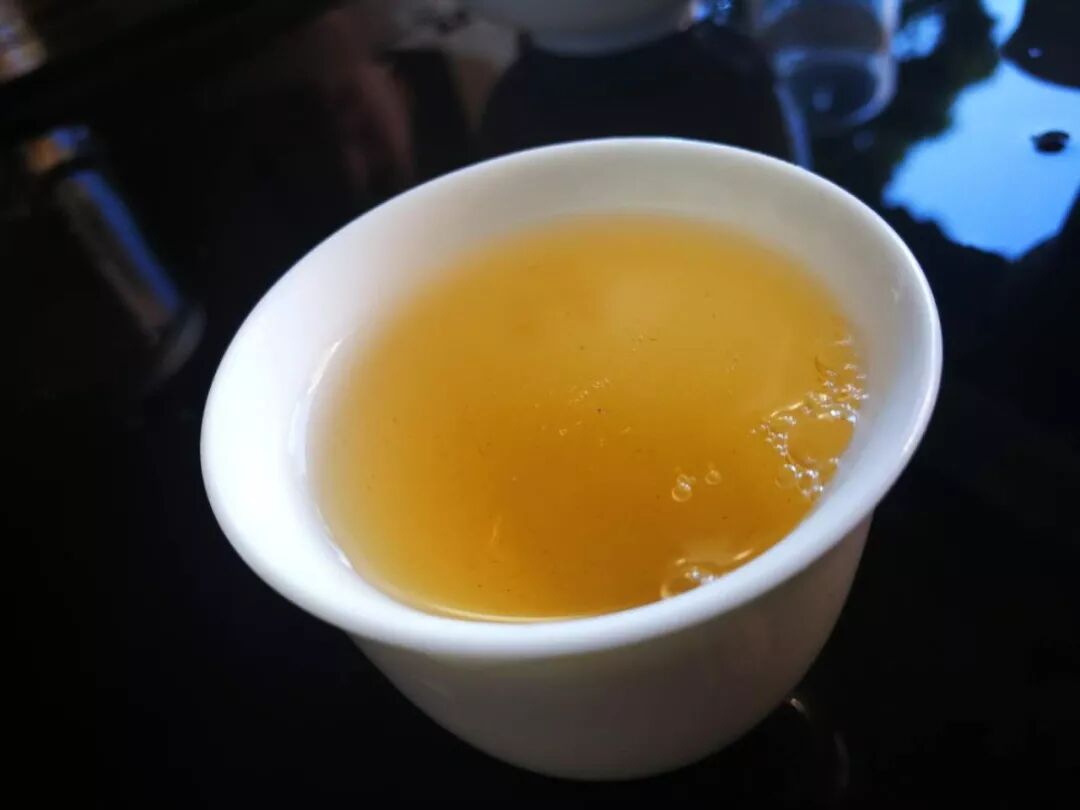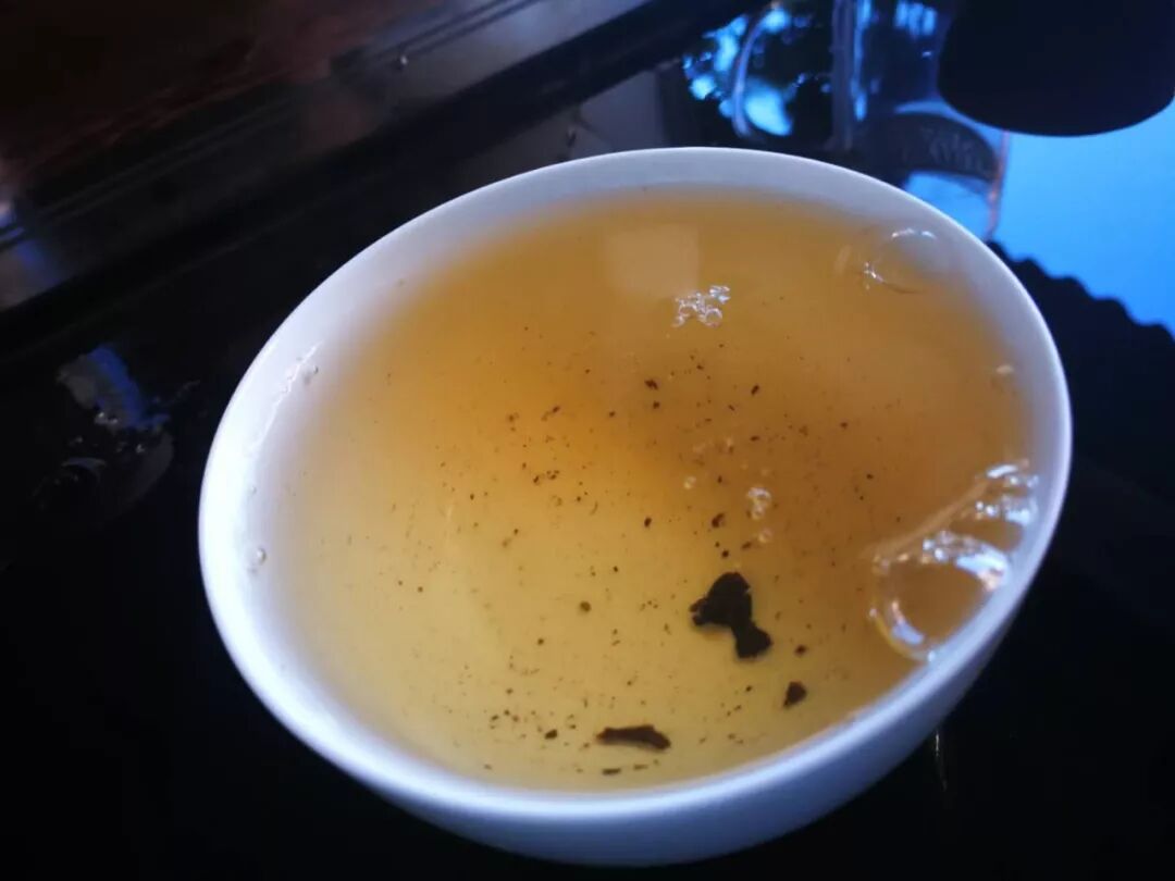 洗兩遍,開始陳香和藥香就比較明顯。這是第三遍的茶湯,也算是第一泡茶了。撬開時茶碎不是很多,所以感覺比較干凈,只有少量的茶沫,下面有茶沫,但茶湯還是非常清澈。