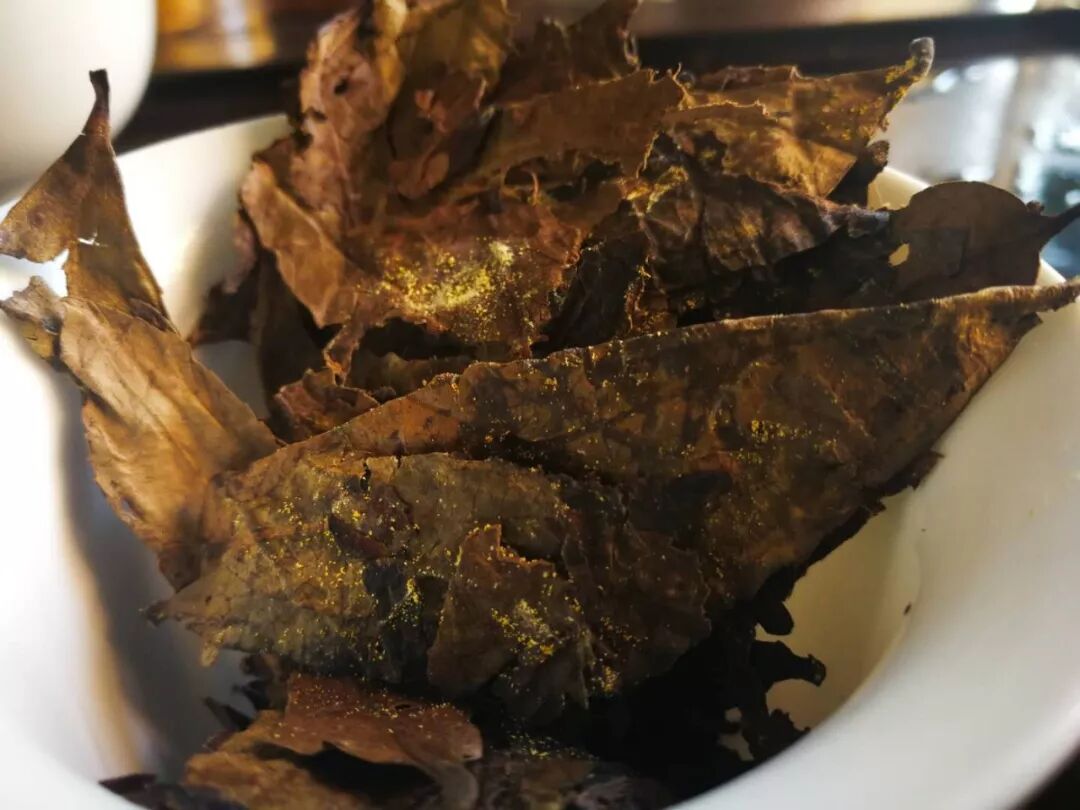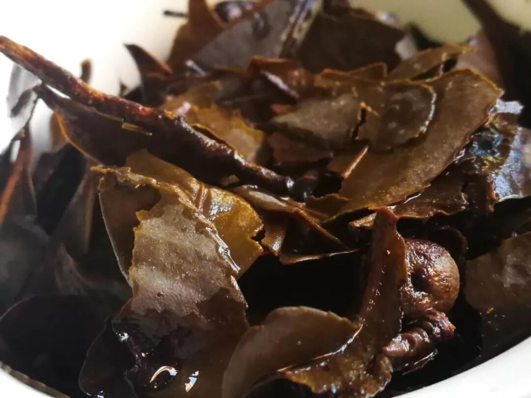 拿出來一看,真是大葉啊,而且還挺厚,這是生長到完全才采摘的。這樣的老葉,茶多糖很多,從多糖可以吸收單糖的角度來看,這款茶非常適合血糖高的人來喝,應該降糖比較明顯。當然如果你血糖較低,喝的時候,一定要邊關注,不要喝到茶醉。