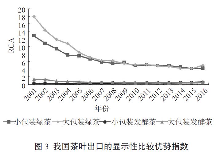 我國茶葉出口的顯示性比較優(yōu)勢(shì)指數(shù)(RCA)見圖3。2001—2016年間,我國的大包裝綠茶和小包裝綠茶的RCA均高于2.5,具有顯示性比較優(yōu)勢(shì),但是從時(shí)間序列來看,兩者都呈現(xiàn)下降趨勢(shì),其中小包裝綠茶的RCA 由 2001年的12.83降到2015年的4.22,大包裝綠茶的RCA由2001年的17.94下降到2015年的4.18,與國際市場(chǎng)占有率指標(biāo)的結(jié)論一致。我國發(fā)酵茶RCA多數(shù)年份低于0.8,顯示性比較優(yōu)勢(shì)非常弱,其中,大包裝發(fā)酵茶的RCA持續(xù)下降,2016年僅為0.48;小包裝發(fā)酵茶的RCA雖然上升,但是其數(shù)值依然很小,顯示性比較優(yōu)勢(shì)依然較弱。這主要是由于我國發(fā)酵茶出口量一直比較少,長期以來在國際市場(chǎng)上沒有競(jìng)爭(zhēng)優(yōu)勢(shì)。