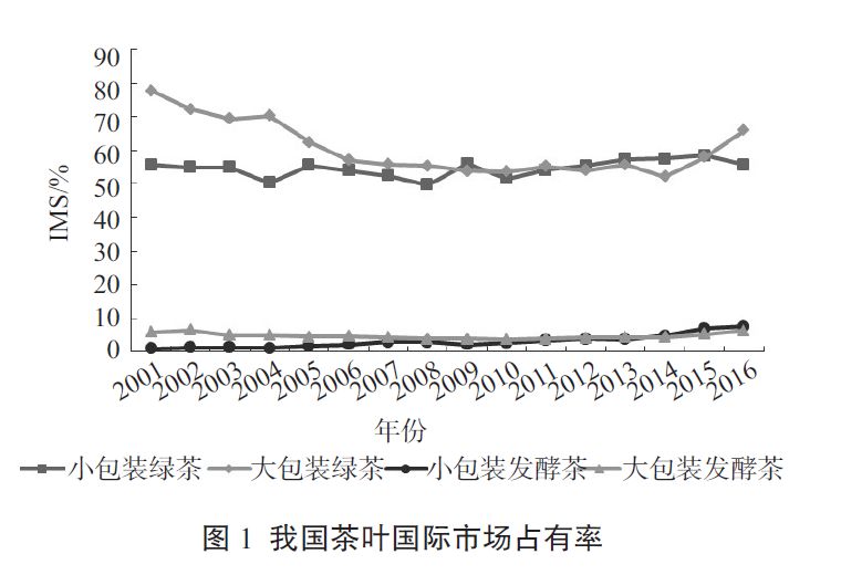 從2001—2016年的我國茶葉國際市場(chǎng)占有率(IMS)數(shù)據(jù)圖(圖 1)顯示,我國茶葉在國際市場(chǎng)的競(jìng)爭(zhēng)優(yōu)勢(shì)主要體現(xiàn)在綠茶貿(mào)易方面,但是我國大包裝綠茶市場(chǎng)份額呈下降趨勢(shì),小包裝綠茶市場(chǎng)份額不穩(wěn)定,我國綠茶國際市場(chǎng)份額下降主要是由于越來越多的國家生產(chǎn)綠茶,加劇了市場(chǎng)競(jìng)爭(zhēng)。如越南,其茶葉產(chǎn)量從2001年的7.57萬t持續(xù)增加至2016年的24萬t,年均增長8.0%,與此同時(shí),其茶葉出口量也從1.7萬t增至13.6萬t,年均增長14.9%,其中綠茶出口量的比重也從2001年的20%增至2014年的51%,2001年其大包裝茶市場(chǎng)份額僅為4.13%,2011年卻達(dá)到了18.78%。印度的綠茶產(chǎn)量也不斷上升,2007—2015年間,印度綠茶產(chǎn)量從9900t增加到了1.9萬t,年均增長7.3%。世界市場(chǎng)茶葉貿(mào)易的80%以上是紅茶,主要由肯尼亞和斯里蘭卡主導(dǎo),中國發(fā)酵茶市場(chǎng)份額極低,其中大包裝發(fā)酵茶市場(chǎng)占有率遠(yuǎn)遠(yuǎn)低于1996年的21.4%,小包裝發(fā)酵茶市場(chǎng)份額雖然增長較快,但依然很低。因此,從國際市場(chǎng)占有率指標(biāo)來看,中國在國際紅茶市場(chǎng)一直處于劣勢(shì),綠茶市場(chǎng)面臨著諸如越南、印度等新興綠茶生產(chǎn)國的潛在競(jìng)爭(zhēng)。