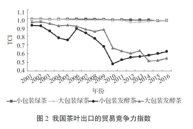 我國小包裝綠茶和大包裝綠茶的貿(mào)易競(jìng)爭(zhēng)力指數(shù)(TCI)始終維持在0.96以上,這主要是由于我國是世界上主要的綠茶生產(chǎn)國和出口國,我國綠茶消費(fèi)需求主要來自國內(nèi),從而顯示出極強(qiáng)的競(jìng)爭(zhēng)力。而發(fā)酵茶的TCI呈現(xiàn)明顯的下降趨勢(shì),尤其是小包裝發(fā)酵茶的TCI從2001年的0.923降至2010年的0.481,之后緩慢增加,大包裝發(fā)酵茶的TCI從2001年的0.960在波動(dòng)中下降至2014年的0.514(圖2),其主要原因在于國外發(fā)酵茶依靠品牌優(yōu)勢(shì)進(jìn)入中國市場(chǎng),如立頓、川寧不僅成為我國消費(fèi)者熟知的品牌,而且逐漸向中國茶葉生產(chǎn)端布局?jǐn)U張。