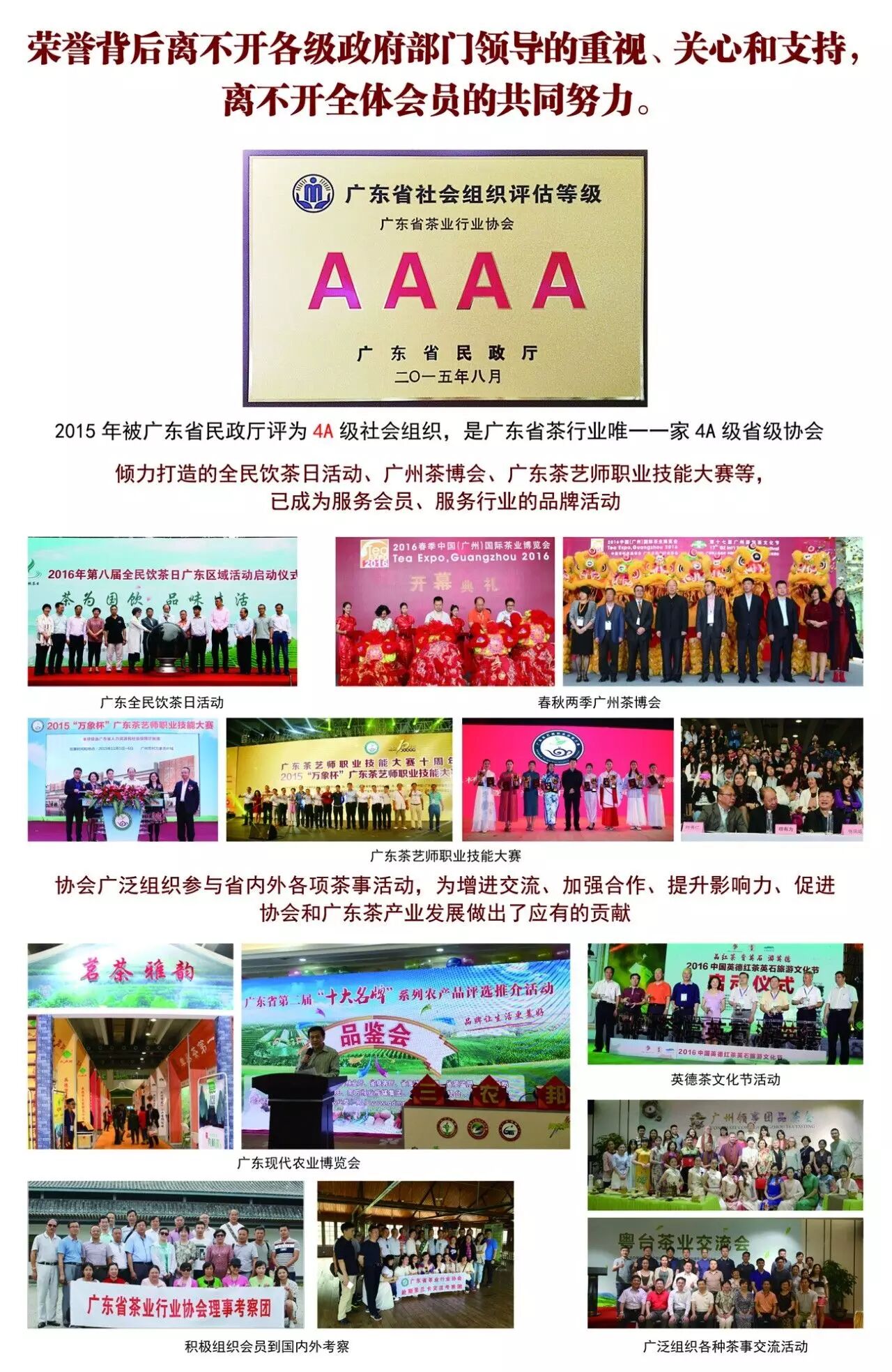 廣東省茶業(yè)行業(yè)協(xié)會憑借完善的管理體系及為行業(yè)、為會員、為政府的優(yōu)質(zhì)服務,在本次評選中榮獲“2016年度優(yōu)秀會員單位”(全省35家)和“2016年度十佳社會組織秘書長”兩項殊榮,這是協(xié)會在各級領(lǐng)導的關(guān)心支持和指導下,在穆有為會長和理事會的正確領(lǐng)導下,全體會員共同努力的成果。今后,我會將繼續(xù)圍繞協(xié)會工作宗旨,加強自身建設(shè),強化內(nèi)部管理,更好地發(fā)揮行業(yè)服務、行業(yè)自律、行業(yè)協(xié)調(diào)、行業(yè)代表的職能,全面推動協(xié)會各項工作再上新的臺階,為行業(yè)和經(jīng)濟社會發(fā)展作出新的更大貢獻。