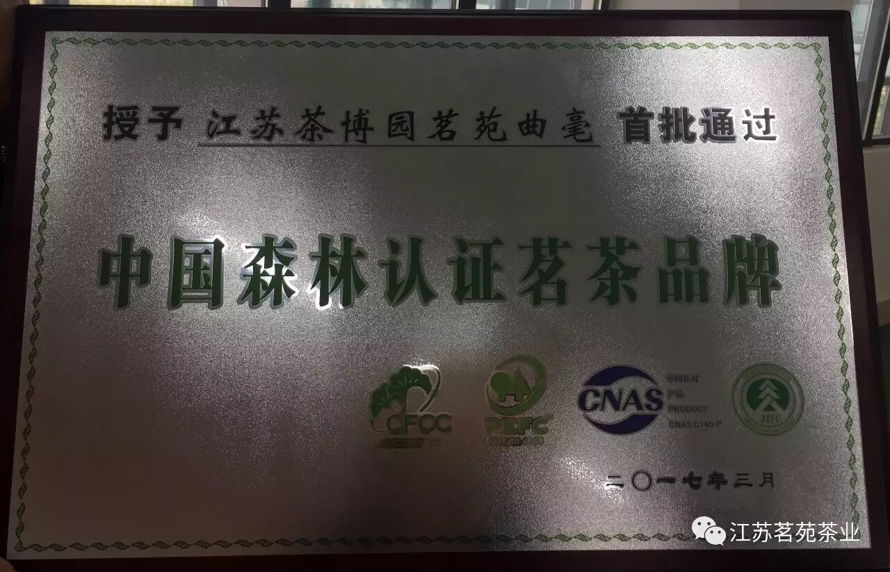 2017年3月25日,中國(guó)首屆茶葉森林認(rèn)證高峰論壇在江蘇茶博園隆重舉行,此次會(huì)議,授予有7個(gè)茶品被授予了“首批通過(guò)森林認(rèn)證茗茶品牌”稱號(hào),由江蘇茗苑茶葉科技開(kāi)發(fā)有限公司出品,江蘇茶博園榮譽(yù)出品的“茅山長(zhǎng)青”與“茗苑曲毫”也位列其中。