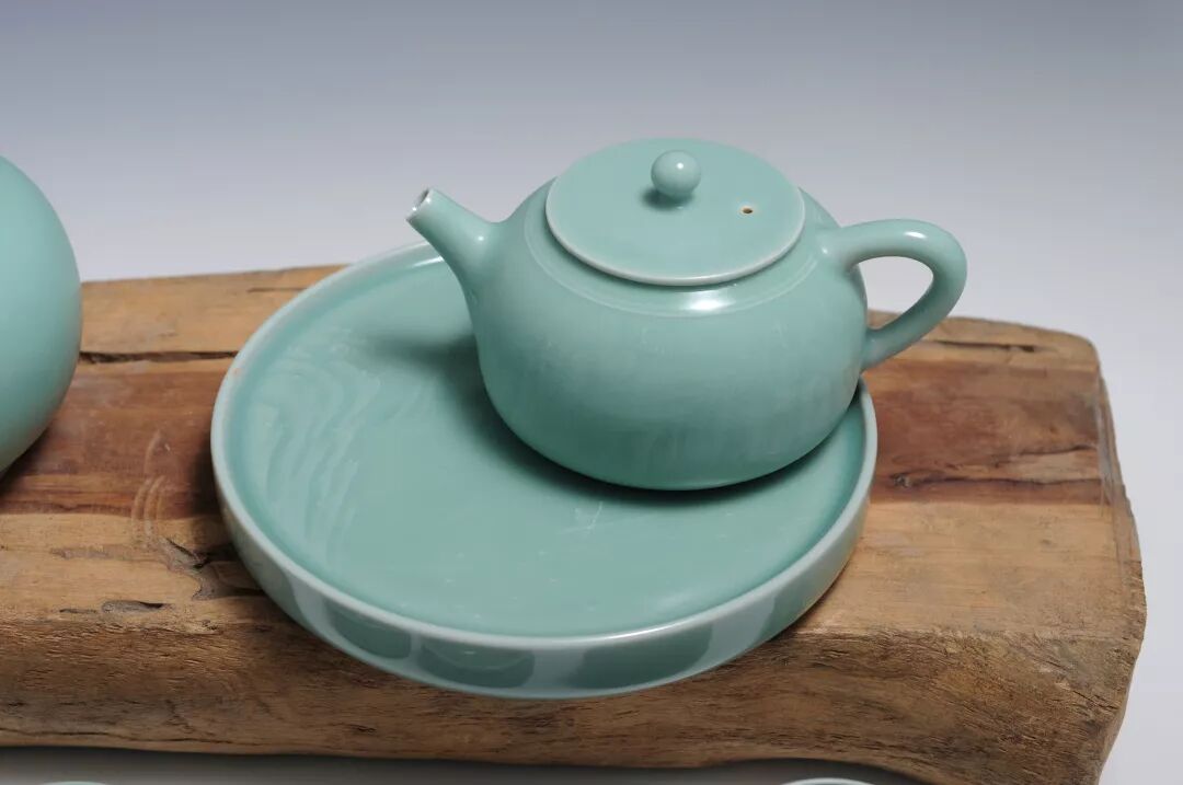 整套茶具用龍泉青瓷中傳統(tǒng)釉色中粉青釉,色澤青如天,面如玉釉面撫之如絹,溫潤(rùn)古樸,釉如堆脂,素靜典雅,色澤滋潤(rùn)內(nèi)斂。