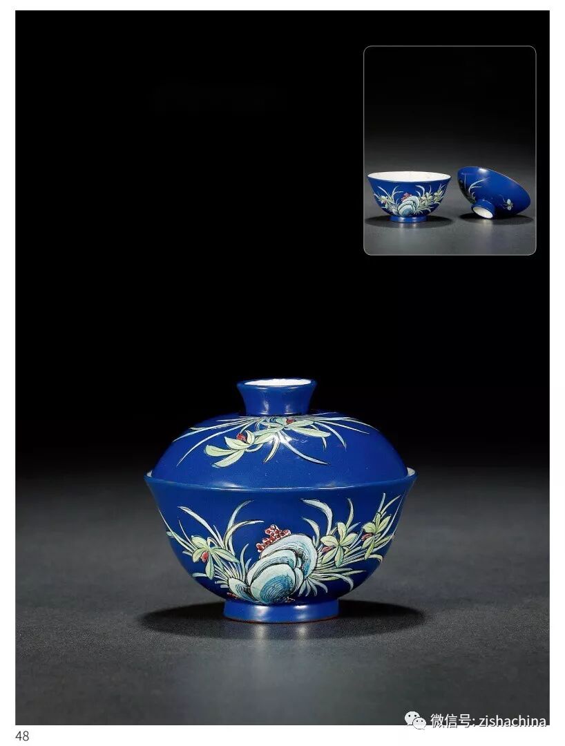 1705 清中期 紫砂胎藍(lán)地粉彩花卉紋蓋碗