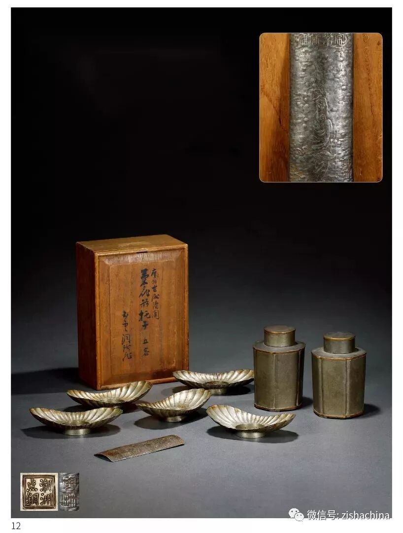 1673 清中期及民國(guó) “潮州點(diǎn)銅”款茶托一套、錫罐一對(duì)、茶則一只