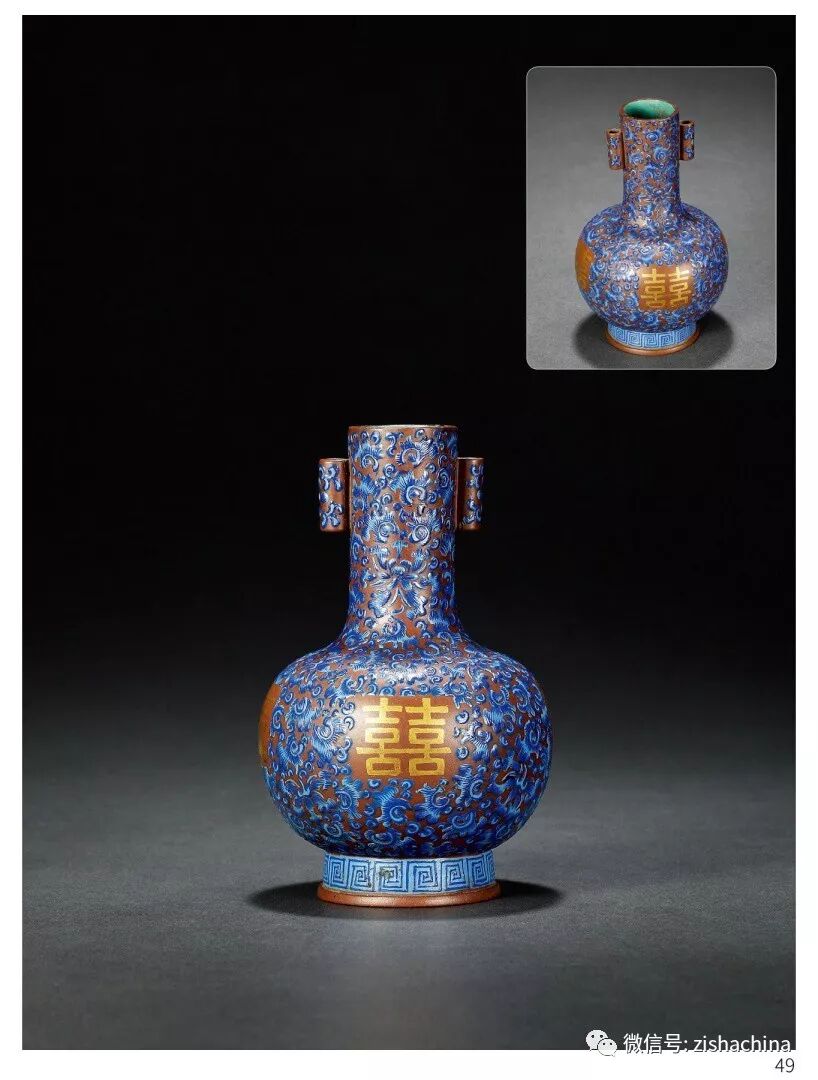 1706 清 紫泥上彩描金“囍”字貫耳瓶