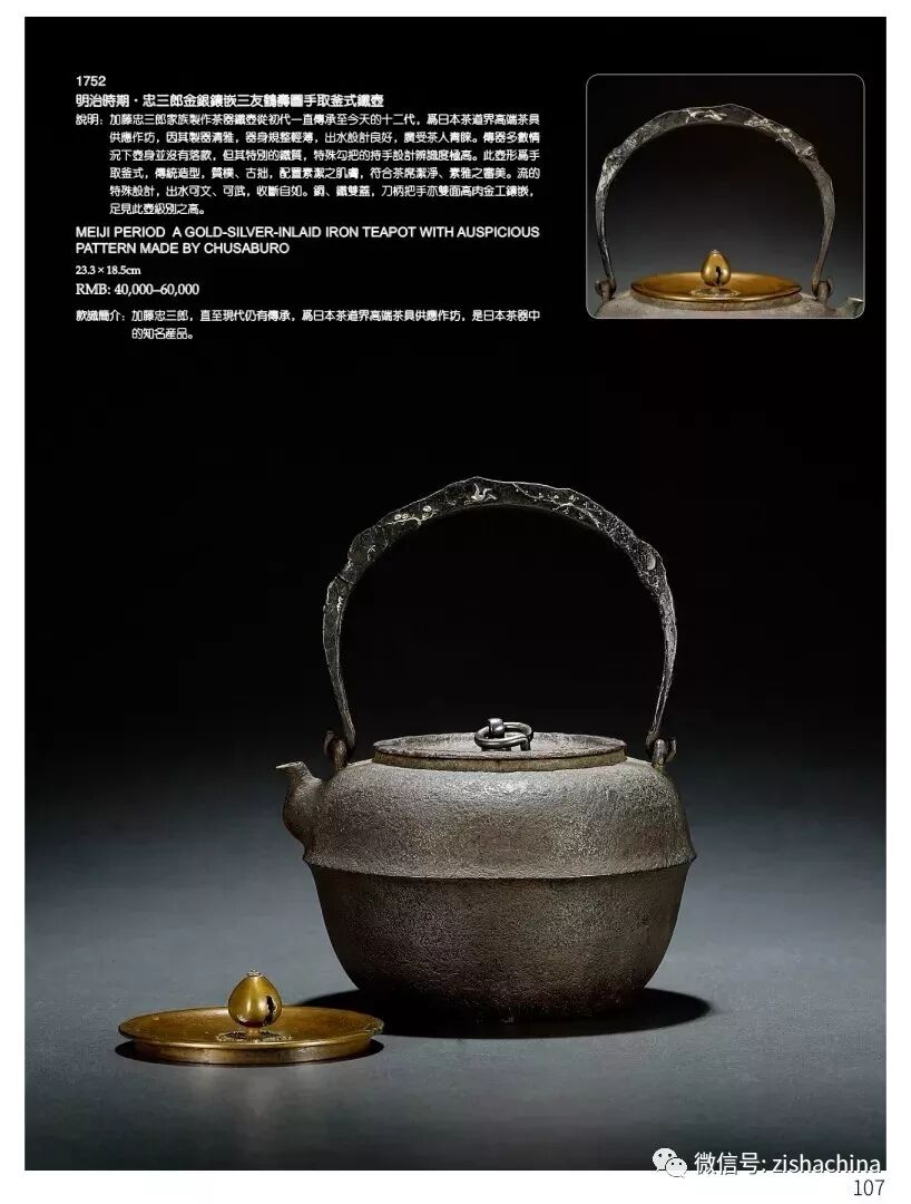1752 明治時(shí)期 忠三郎金銀鑲嵌三友鶴壽圖手取釜式鐵壺