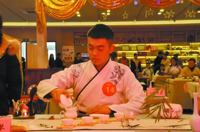 茶藝師大賽決賽共設(shè)置了功夫茶藝、創(chuàng)新茶藝、斗茶、茶席設(shè)計(jì)四個(gè)小組分別進(jìn)行比賽。茶藝師們端坐在自己布置的茶席旁,盡情發(fā)揮;持茶藝專業(yè)裁判員證二十余人參加執(zhí)裁。評(píng)委老師對(duì)參賽者的茶藝基礎(chǔ)和表演的創(chuàng)作部分進(jìn)行嚴(yán)謹(jǐn)?shù)钠饰龊驮u(píng)分。問(wèn)道茶社師生代表學(xué)校參加了本次比賽。蜀興職中五位同學(xué)進(jìn)入決賽,兩位男生分別獲得冠亞軍。