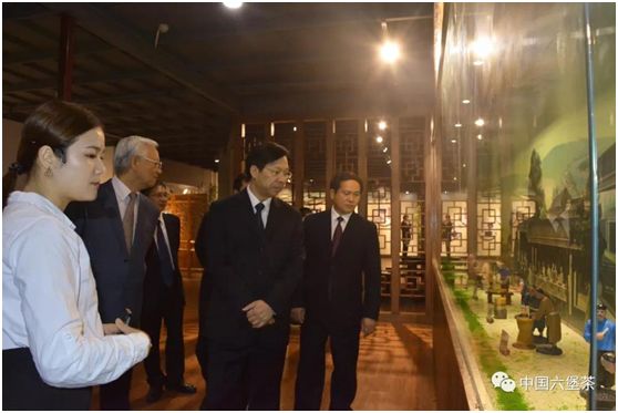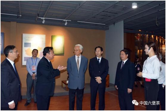 自治區(qū)政協(xié)副主席劉慕仁,中國珠寶玉石首飾行業(yè)協(xié)會名譽(yù)會長、原地礦部副部長陳洲其,梧州市委書記全桂壽,梧州市市長李杰云等領(lǐng)導(dǎo)蒞臨了六堡茶文化展示館,了解六堡茶“茶船古道”歷史文化。