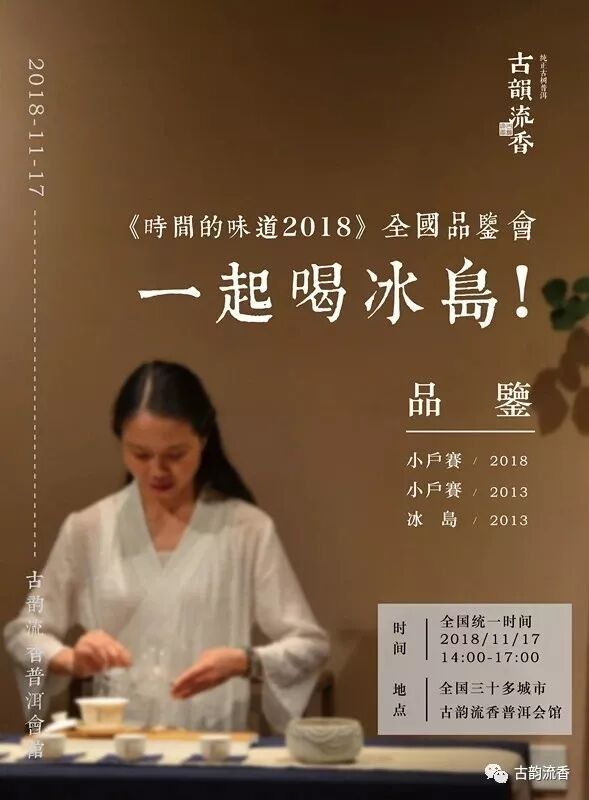 11月17日(周六)下午14:00 ,全國同步舉辦古韻流香“時間的味道 2018”全國品鑒會,品鑒13年冰島陳茶及新老小戶賽,誠摯邀請各位茶友蒞臨品鑒。