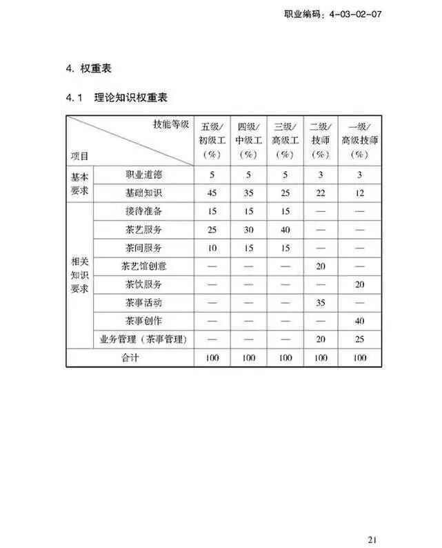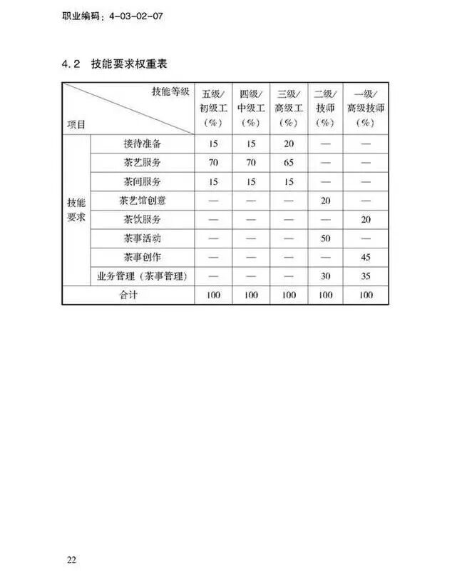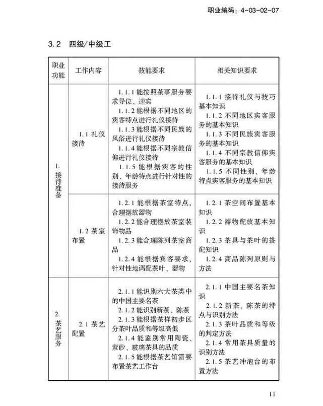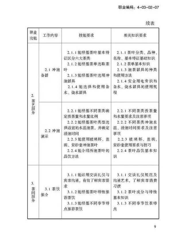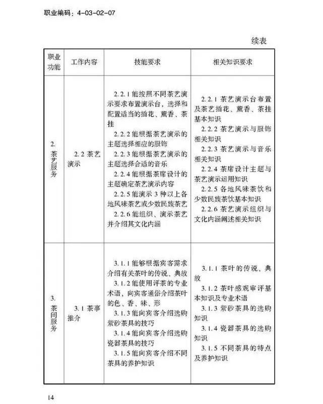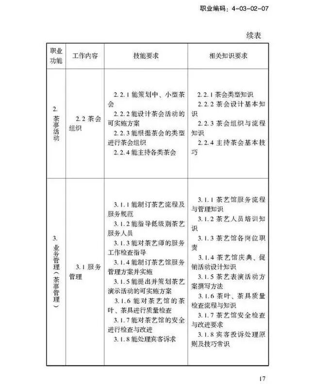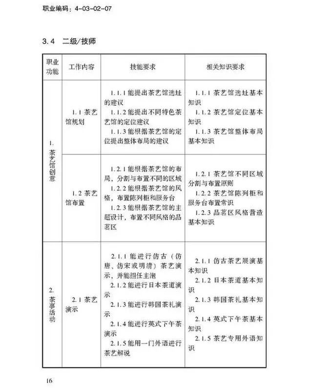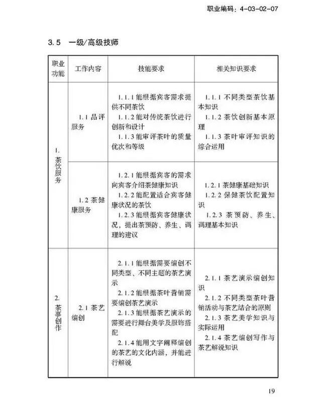 第二,茶藝師技能等級劃分界定更加具體。新標準在茶藝師初級、中級、高級、技師、高級技師五個等級劃分的基礎上,做了更加具體的要求。例如,新標準將初級、中級、高級茶藝師界定為技能型人才;將茶藝技師、茶藝高級技師界定為高端技能型、技能管理型人才。新標準要求技師以上職稱的茶藝師要具備制訂茶藝培訓方案、進行行業(yè)調(diào)研、撰寫茶藝相關論文等能力。