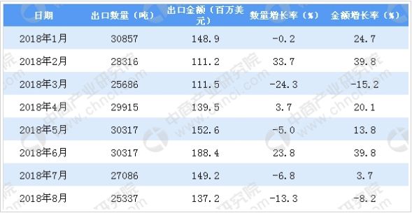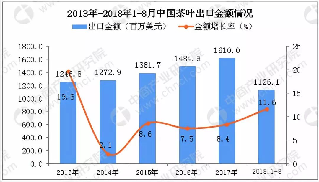 從金額方面來(lái)看,2013年-2017年中國(guó)茶葉出口金額逐漸增長(zhǎng),2017年中國(guó)茶葉出口金額為1610百萬(wàn)美元,同比增長(zhǎng)8.4%。2018年1-8月中國(guó)茶葉出口金額為1126.1百萬(wàn)美元,同比增長(zhǎng)11.6%。