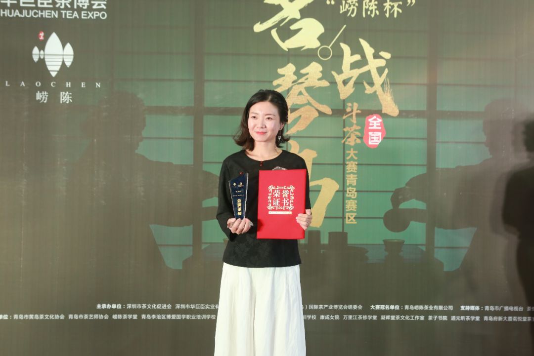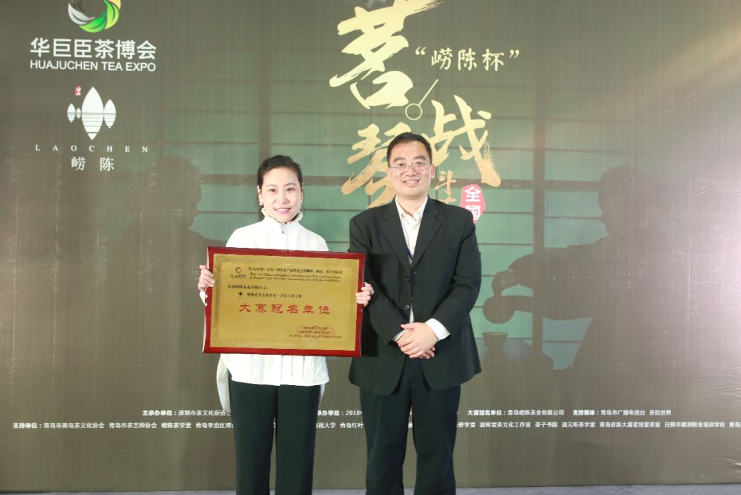 最后,由深圳市華巨臣實(shí)業(yè)有限公司總經(jīng)理葉木甦為大賽冠名單位青島嶗陳茶業(yè)有限公司總經(jīng)理王珊珊授“大賽冠名單位”獎(jiǎng)牌。