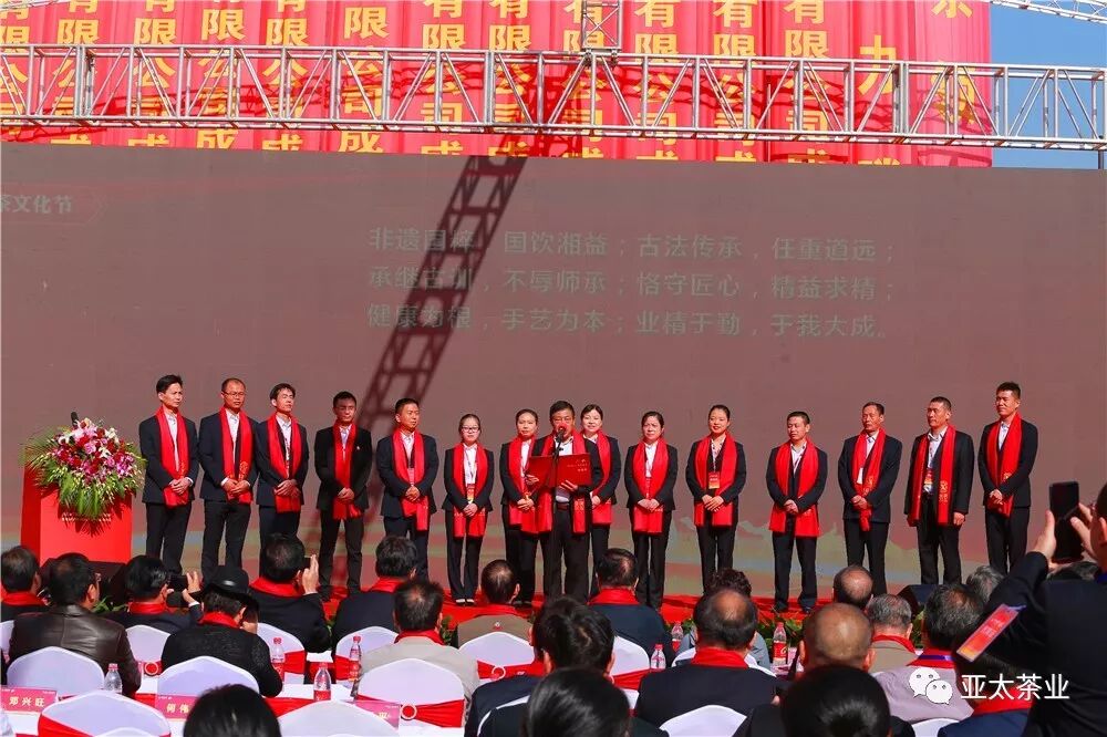 慶典活動(dòng)上還特別展示了益陽茯磚茶制作技藝被列入國家級(jí)非物質(zhì)文化遺產(chǎn)保護(hù)名錄的批準(zhǔn)文件——文化和旅游部文旅非遺發(fā)〔2018〕8號(hào)文件。在全體來賓的見證下,國家級(jí)非遺代表性傳承人劉杏益及科研核心團(tuán)隊(duì)也大聲宣讀了他們的制茶宗旨和心聲。他們神情莊重,高聲宣讀口號(hào):“非遺國粹,國飲湘益,古法傳承,任重道遠(yuǎn),承繼古訓(xùn),不辱師承,恪守匠心,精益求精,健康為根,手藝為本,業(yè)精于勤,于我大成”??谔?hào)雖然不長,但字字鏗鏘,傳遞著宣誓人弘揚(yáng)黑茶文化、肩負(fù)使命的堅(jiān)定決心。