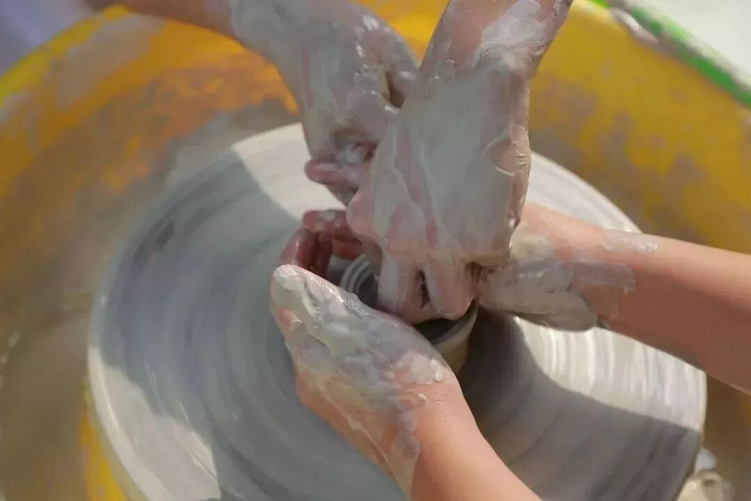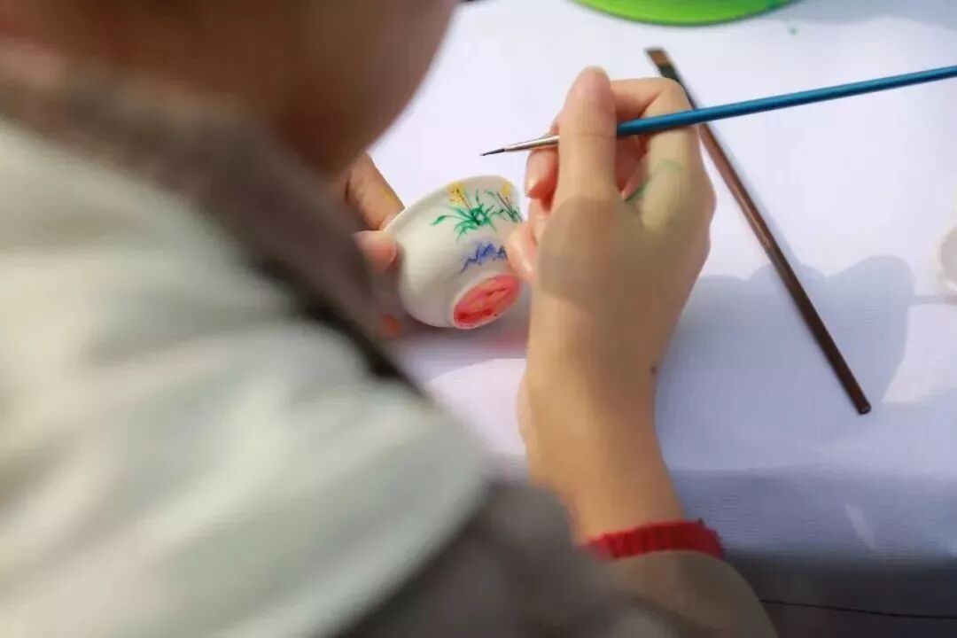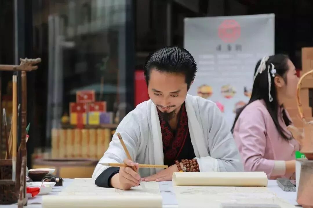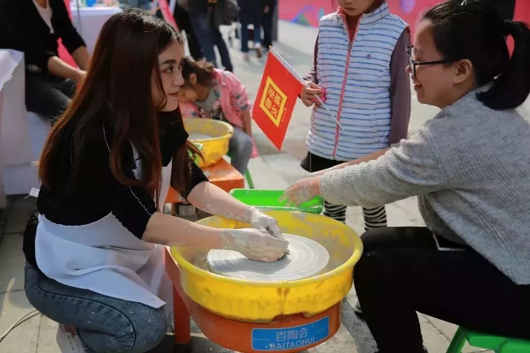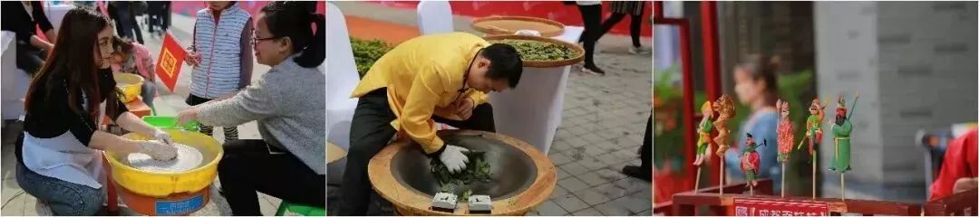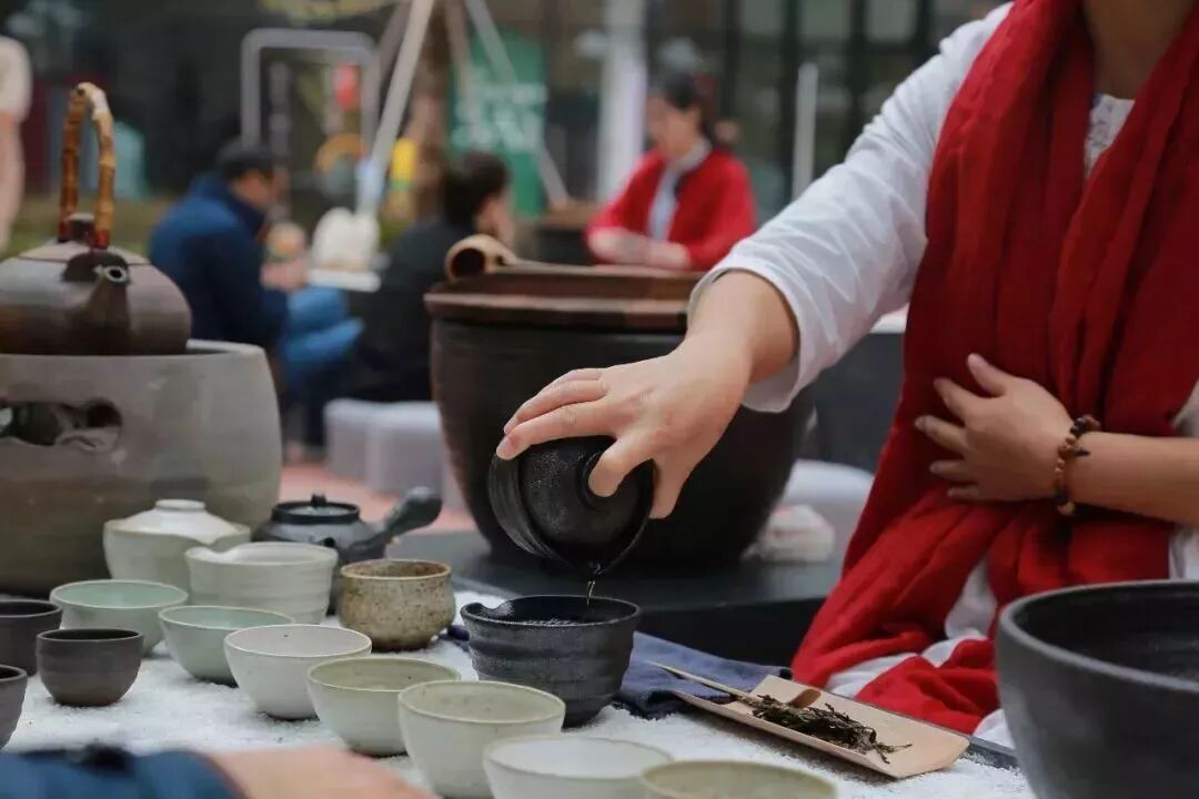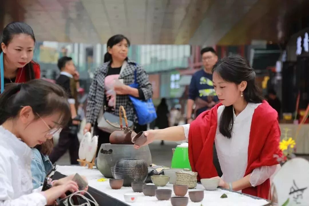 廣場、街道上,行人紛紛,商家遍布,陶藝、書法、剪紙、繪畫、捏面人,做香囊、現(xiàn)場炒茶等手工體驗區(qū)吸引大量游客互動參與,集民間技藝,吃喝玩樂為一體。