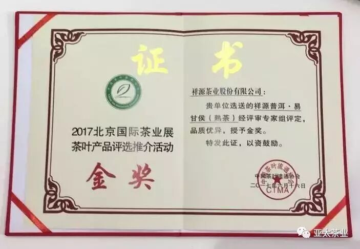 祥源茶普洱系列之易甘侯(熟茶)經(jīng)專業(yè)評定獲得2017茶葉產(chǎn)品評選推介活動金獎