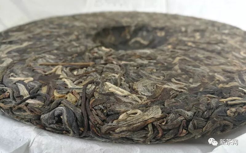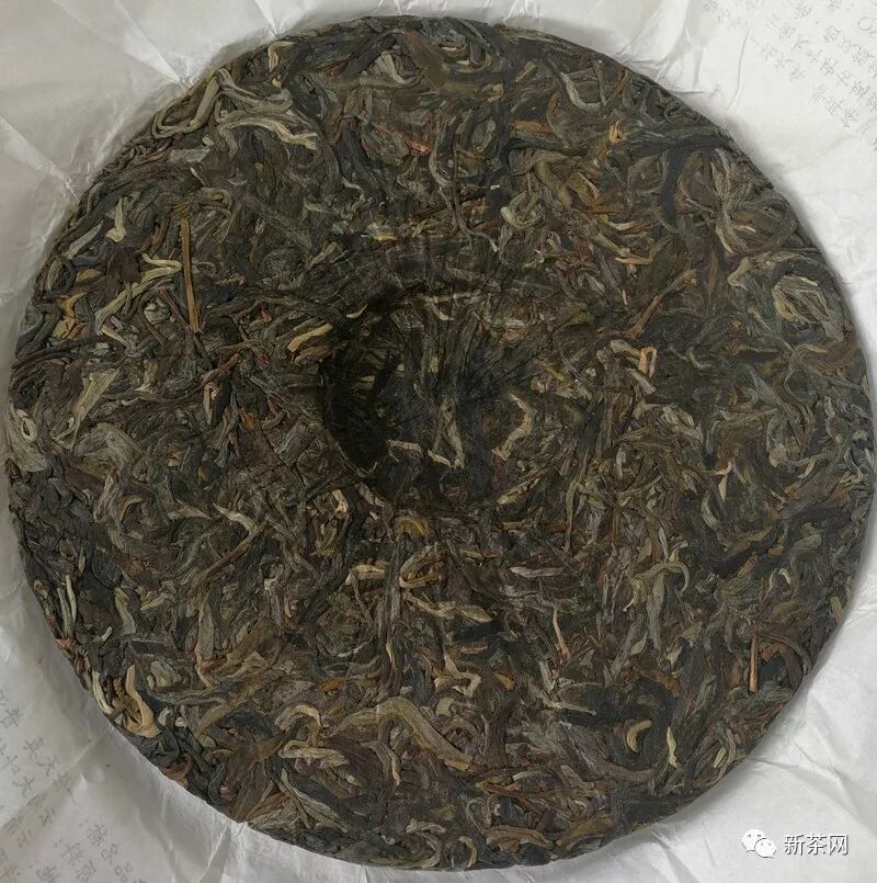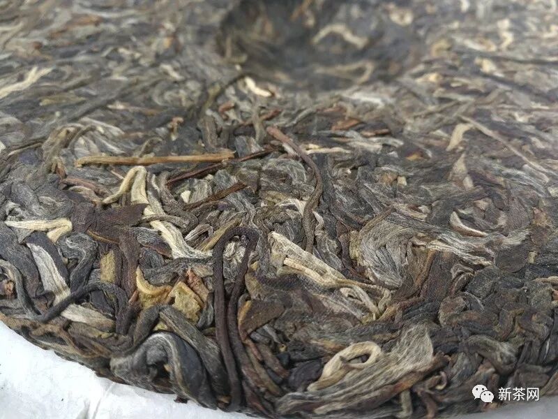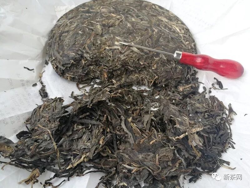 包裝及干茶測評:包裝簡潔規(guī)整,水墨畫背景很有一任天真的特點。打開包裝紙一股花果香撲面而來,細聞甜香比較明顯,山野氣息濃郁;無煙味兒,無倉味兒及其他不良氣味兒;干茶條索粗壯顯毫,有少量茶梗,茶餅呈灰褐色,給人一種灰蒙蒙的感覺;茶餅規(guī)整,壓制薄而緊,邊緣撬起來不費力,撬下來的茶條索較完整,撬到中間部位就硬的開始掉渣,撬開可見內(nèi)外用料一致,見下圖: