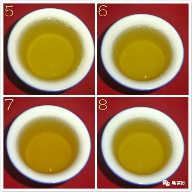 第5泡,茶湯粘稠,湯香略減;茶湯入口有澀感,澀感比之前段略減,舌面有收斂感;生津回甘減弱,卻留下了口齒間持久的香甜;喉韻不減,滿腹甜意。