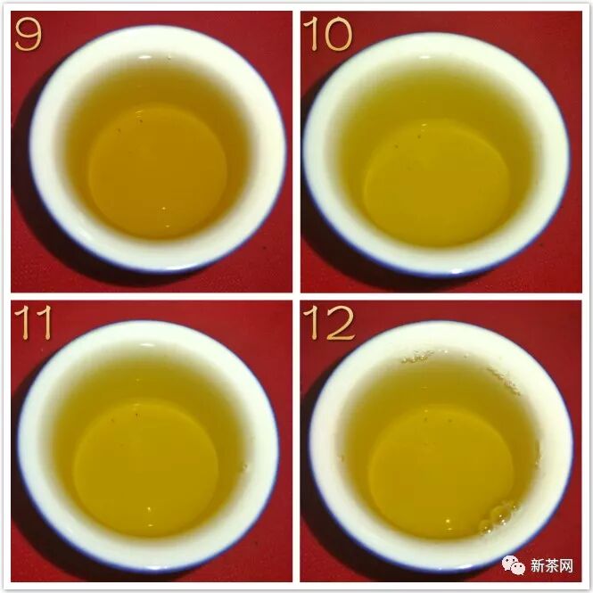 9-12泡(30-45秒出湯),隨著出湯時間的延長,第9泡湯色比之中段雖有加深,但粘稠度已大不如前;整體上,茶湯香味兒淡了,澀感也弱了,生津和回甘也弱了,甜意還在只是香韻差了;第11泡水味兒顯,耐泡度還行,見下圖: